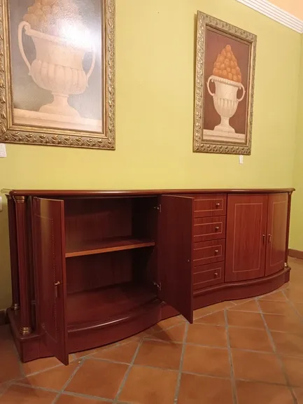 • Este aparador clásico de la colección Cerdeña es una pieza que destaca por su elegancia serena y su impecable funcionalidad. Fabricado con un acabado en tono caoba cálido, su diseño curvado en la base y detalles de molduras doradas le otorgan un carácter distinguido, ideal para comedores o salones con un estilo tradicional o colonial.