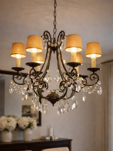 Inspirada en los antiguos chandeliers europeos, esta lámpara de araña encaja tanto en un comedor principal como en un salón de estilo tradicional, provenzal o rústico elegante. El acabado oscuro del hierro aporta carácter y contraste, mientras los colgantes de cristal añaden ligereza visual, evitando que el conjunto resulte pesado. El resultado es una iluminación decorativa equilibrada: protagonista sin ser excesiva, refinada sin perder calidez.