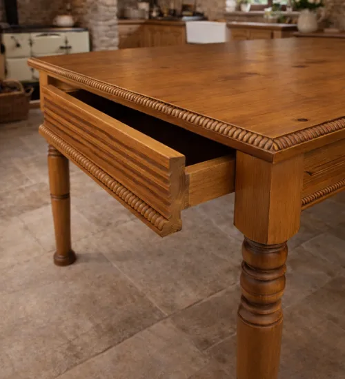 - Mesa para comedor rústica tallada con dos cajones laterales.